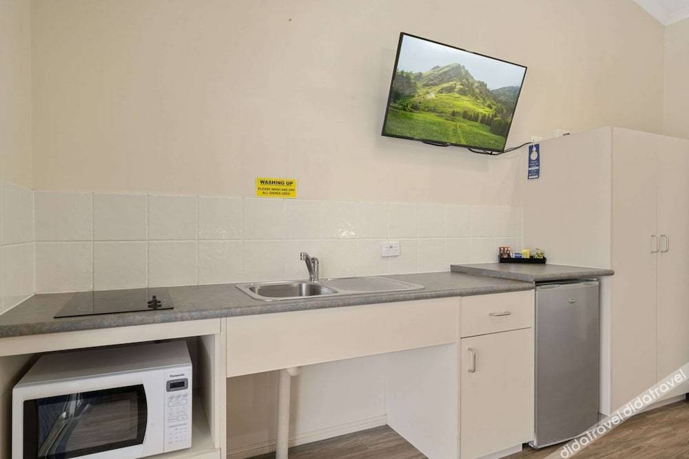 Features a kitchenette area with hotplate, microwave and refrigerator.